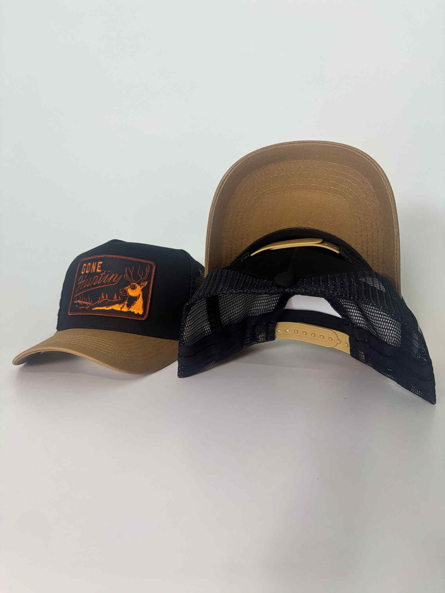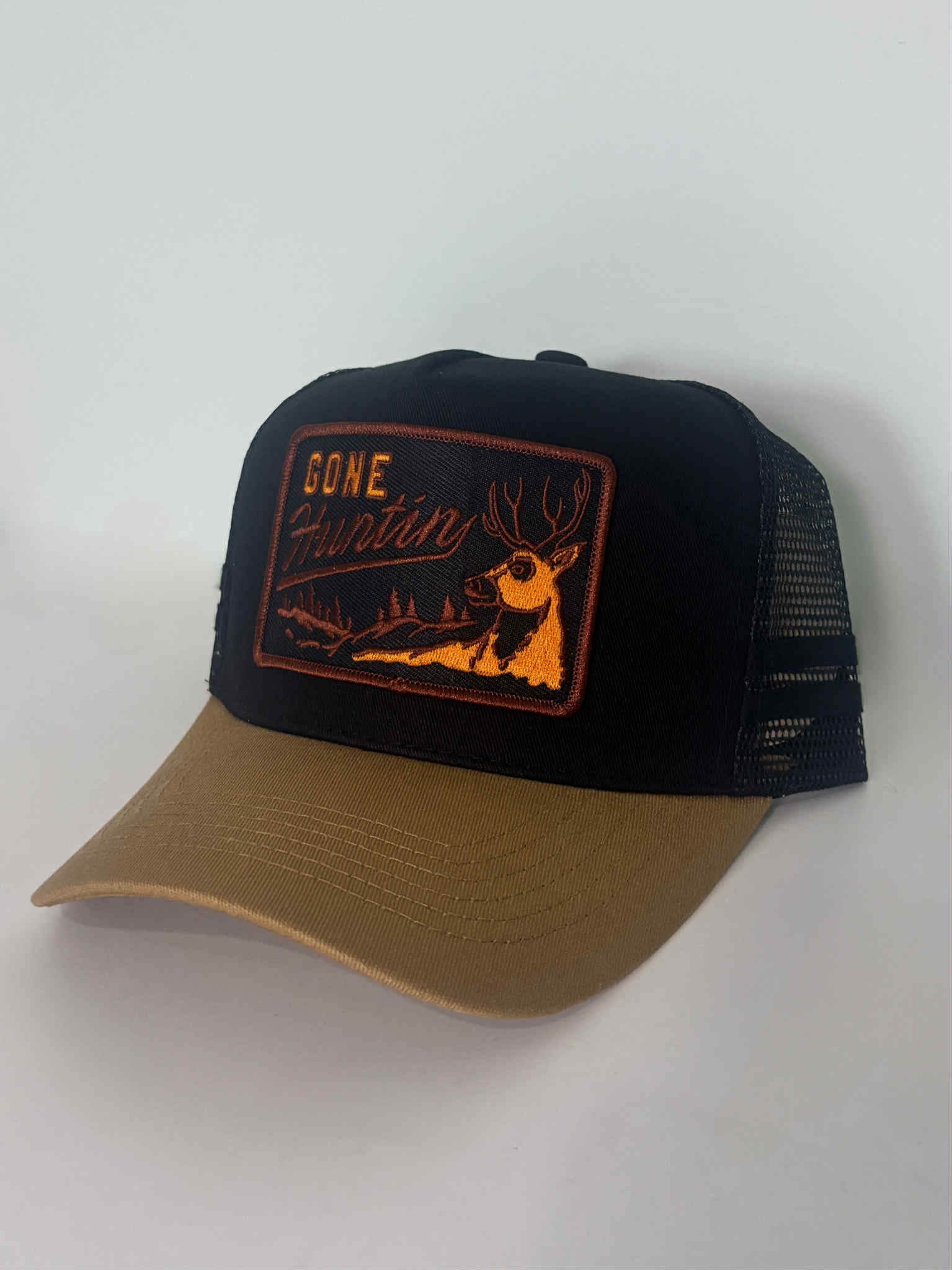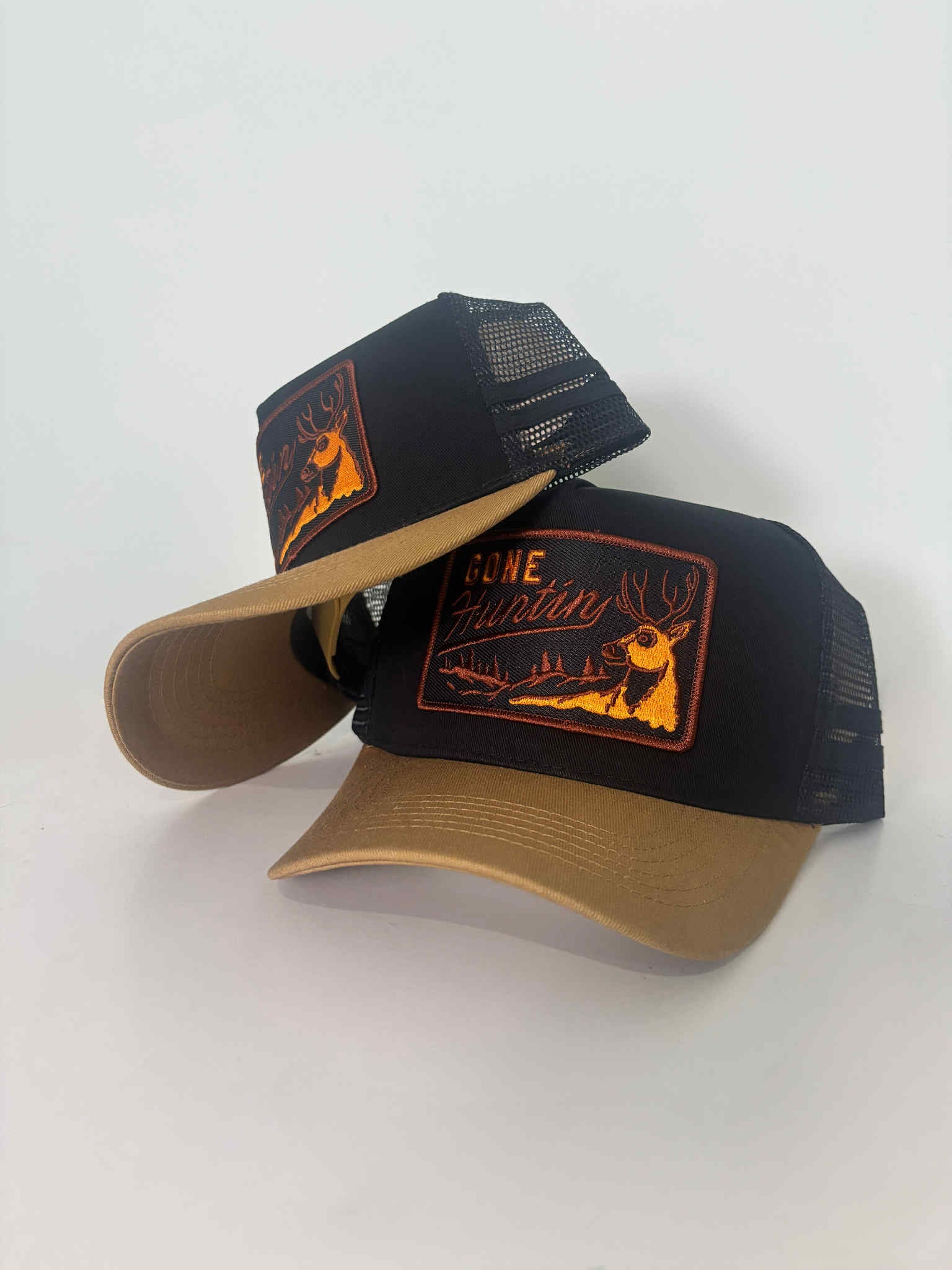 Gear up for your next hunting trip with our 'GONE HUNTIN’ trucker caps! A classic black cap with a brown brim and an orange 'GONE HUNTIN' patch featuring a deer illustration. Perfect for hunters and outdoor enthusiasts, these caps combine style and functionality for any adventure.