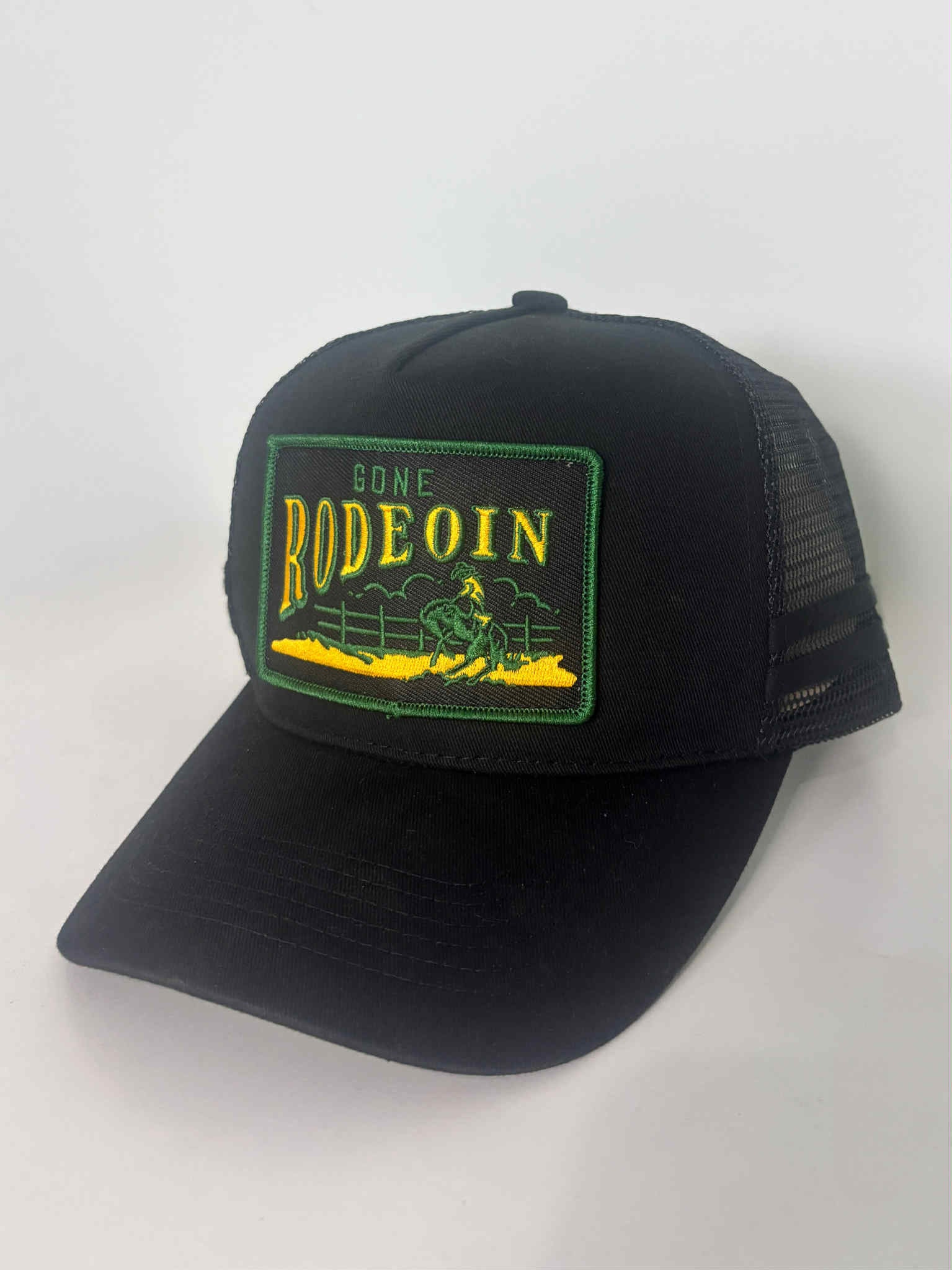 Hit the rodeo or the open road with our 'GONE RODEOIN' trucker hat. This black cap features a detailed green and yellow cowboy and horse design, perfect for adding a touch of Western charm to any outfit. The breathable black mesh back ensures all day comfort, while the adjustable snap closure provides a secure fit. The green underbrim also reduces glare. Get yours today and ride in style!